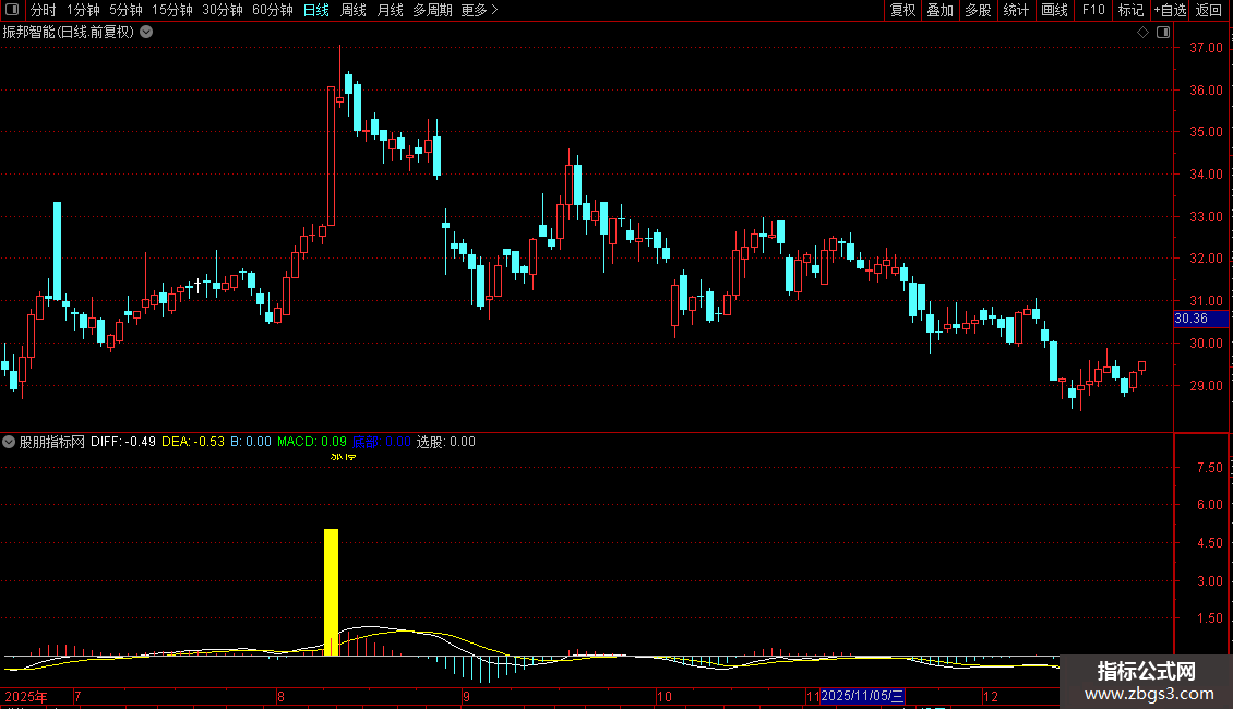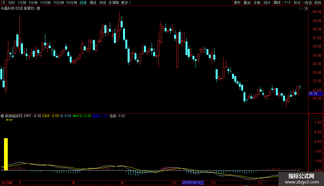 底部:IF(B<0 AND CROSS(MACD,0),50,0),COLORBLUE;