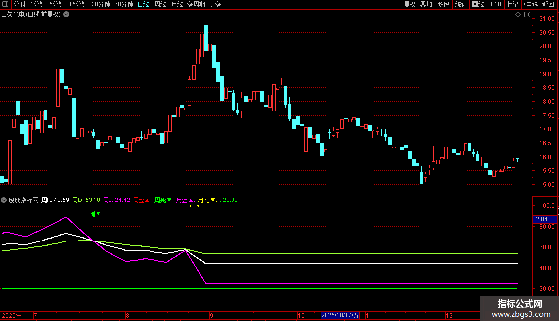 周K:MA("KDJ.K#WEEK"(N,M1,M2) ,5),LINETHICK2,COLORWHITE;