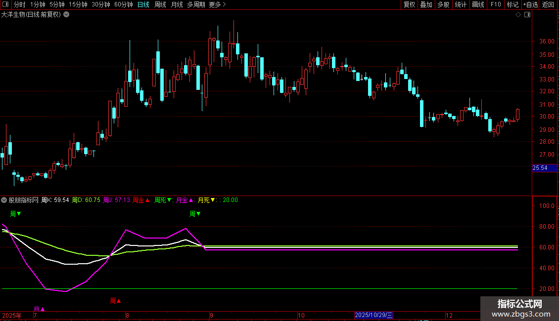 周死▼:DRAWTEXT(CROSS("KDJ.D#WEEK"(N,M1,M2),"KDJ.K#WEEK"(N,M1,M2)) ,92,'周▼'),COLORGREEN;