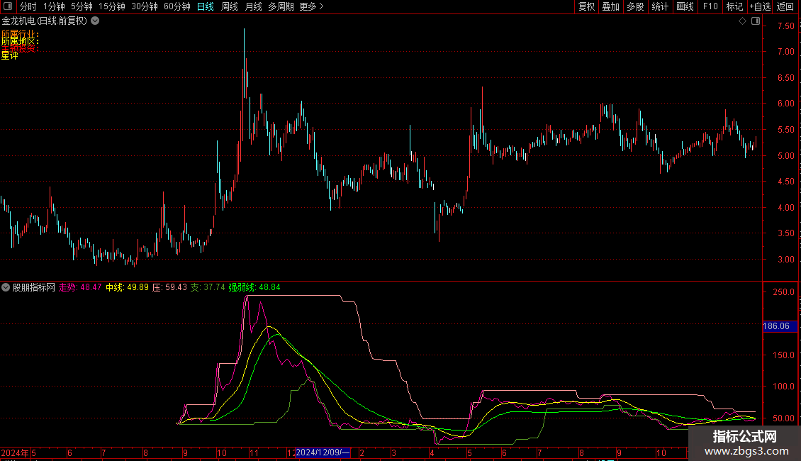 {这是一个副图指标,指标中除了中线外还加入了支撑和压力线。