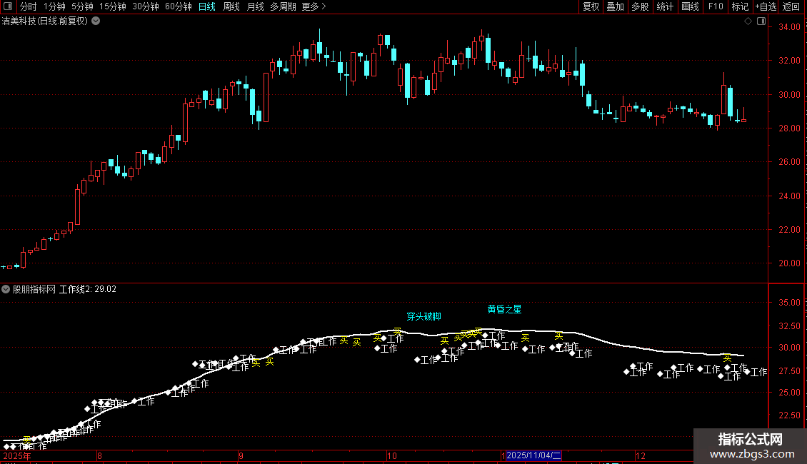 DRAWTEXT((工作线>=REF(工作线,1) AND 牛 AND L< 工作线 AND H>工作线) ,L*0.96 , '◆工作'),COLORWHITE;