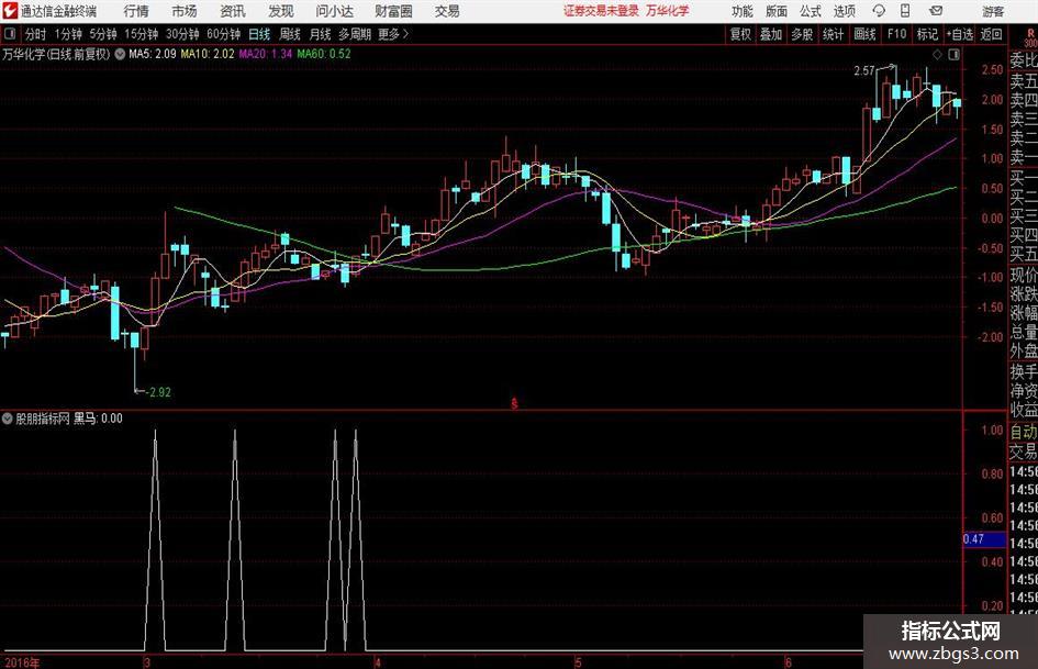 VAR15:=(crOSS(VAR13,VAR14) AND VAR13< -0.04 AND (C-REF(C,1))/REF(C,1)>=0.03) OR (CROSS(VAR13,VAR14) AND VAR13<=-0.14 ) OR (CROSS(VAR13,VAR14) AND VAR13<=0.05 AND (V/MA(V,5)>2 OR C/REF(C,1)>0.035)) AND VAR10 AND VAR11;