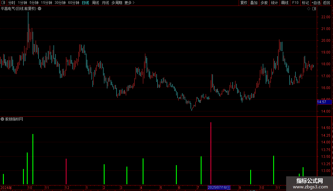 STICKLINE(C/REF(C,1)<0.901,VZ,(0-HLMN3)*HLMN2/HLMN4+HLMN1,2,0),COLORGREEN;