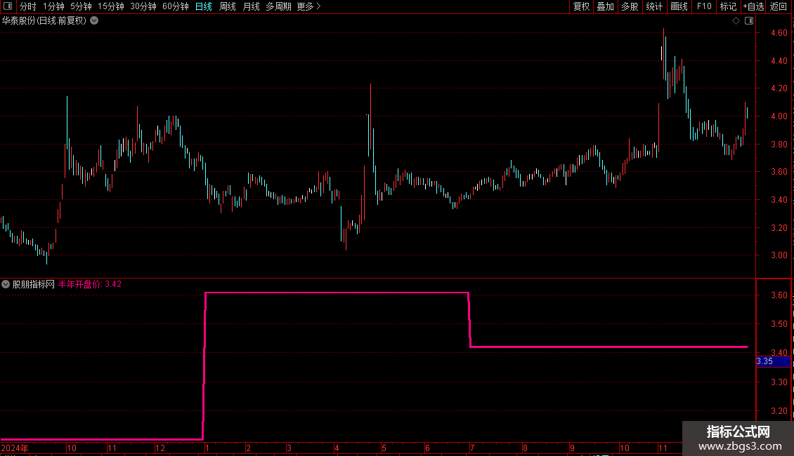 半年开盘价:REF(O,BARSLAST(MOD(MONTH,6)=0)-1),COLORLIMAGENTA,LINETHICK3;