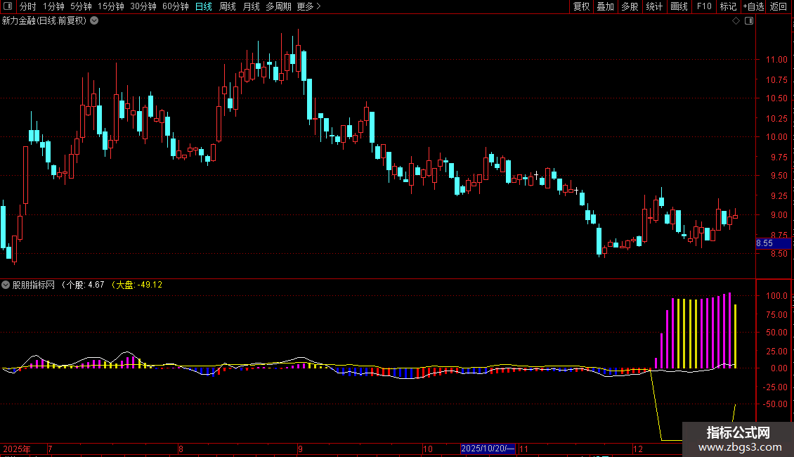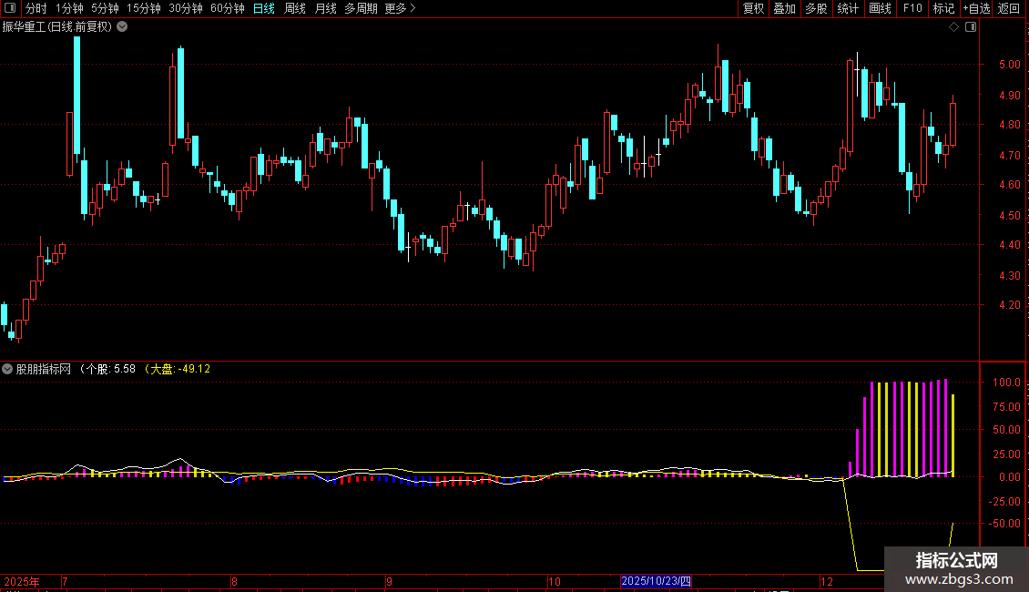 强弱值:=MA(个股-大盘,2),COLORSTICK;