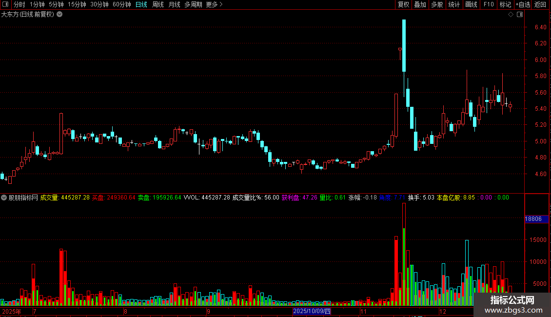 当满足条件VOLANDVAR33<=VAR44时,在0和成交量(手)位置之间画柱状线,宽度为2.5,1不为0则画空心柱.,画青色