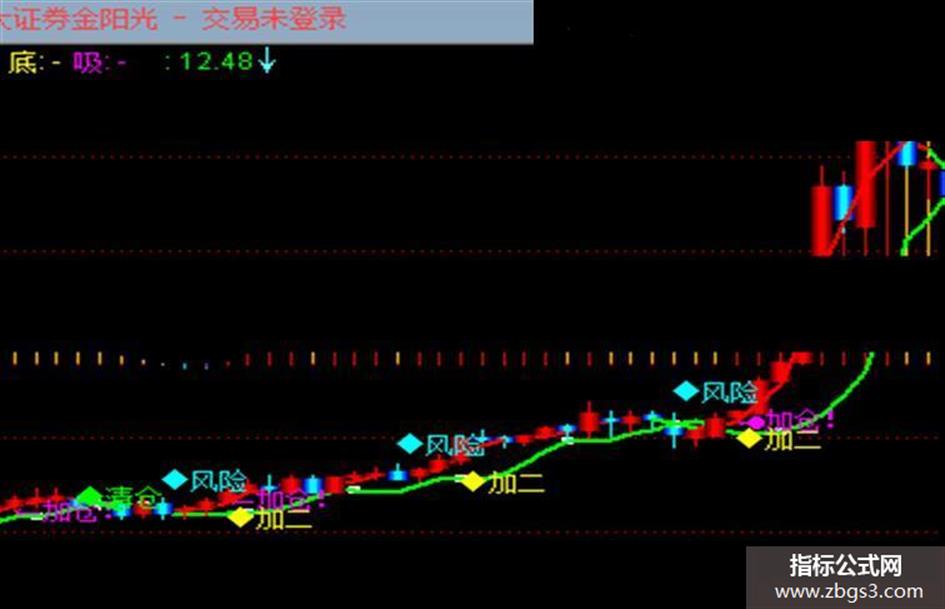 DRAWTEXT(CROSS(MA(C,3),MA(C,9)) AND C>=REF(C,1) AND C>O,L*1.00,'←加仓!'),COLORMAGENTA;