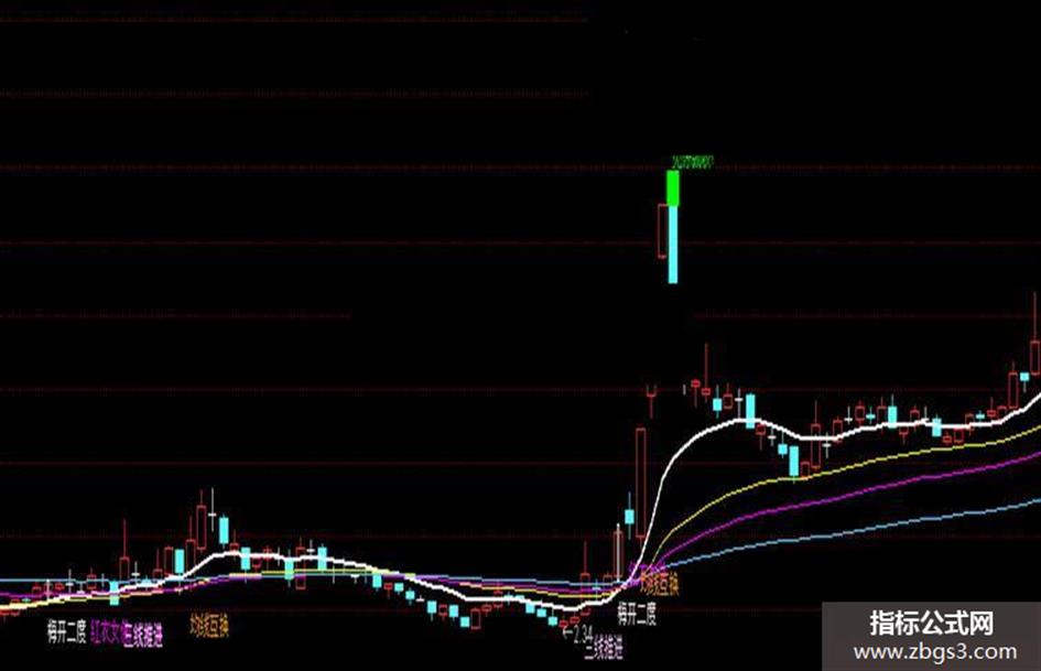 形态特征:股价经过长期下跌或充分调整以后,55日均线基本处于水平状态。股价沿着13日均线爬至55日均线附近进行窄幅整理。在13日均线上穿55日均线之日,如果股价携量上攻,形态即告成立。把站在"右上角"结点处的那根阳线称之为"红衣侠女"。是即将拉升的标志之二。
