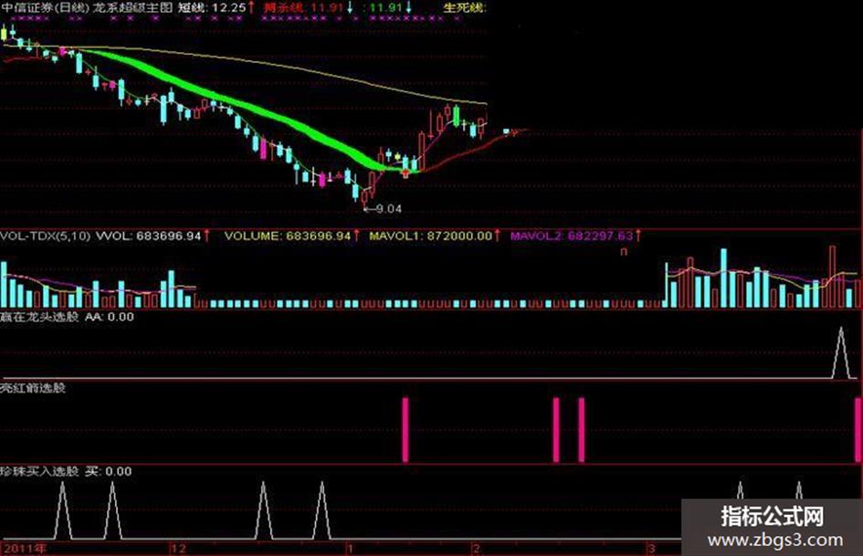 生死线,并调头向上股价进入强势。红箭头处全面几天快速缩量买入。股价最低处有绿块,注意股价再次启动。