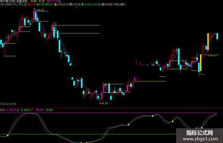 RSV:= (CLOSE-LLV(LOW,14))/(HHV(HIGH,14)-LLV(LOW,14))*100; FASTK:=SMA(RSV,3,1); K:SMA(FASTK,3,1),LINETHICK1,COLORMAGENTA; D:SMA(K,2,1)COLORGREEN; 85;30; TJ1:=CROSS(K,D); DRAWTEXT(TJ1,K,'▲'),COLORYELLOW;