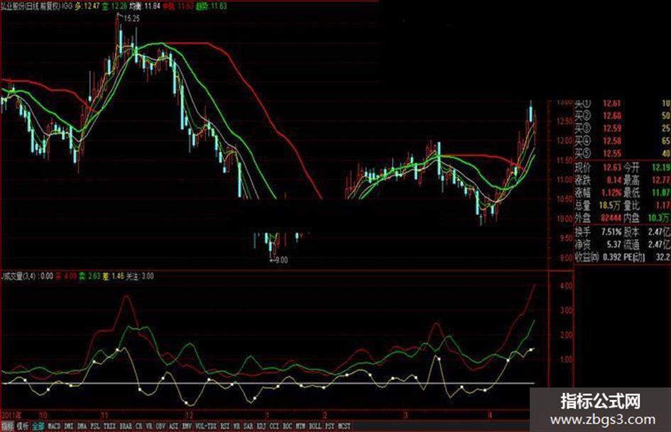 红线,为正成交量,即买盘。绿线,为负成交量,即卖盘。黄线,为(红线-绿线)的差值。