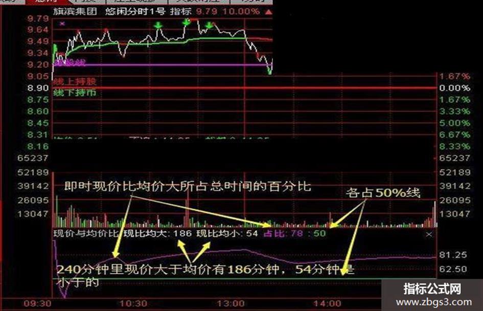 指标里有几个数据,现比均大是指现价大于均价所占的时间,现比均小是指现价比均价小所占的时间,占比大于50表示白线在黄线上方的时间多。