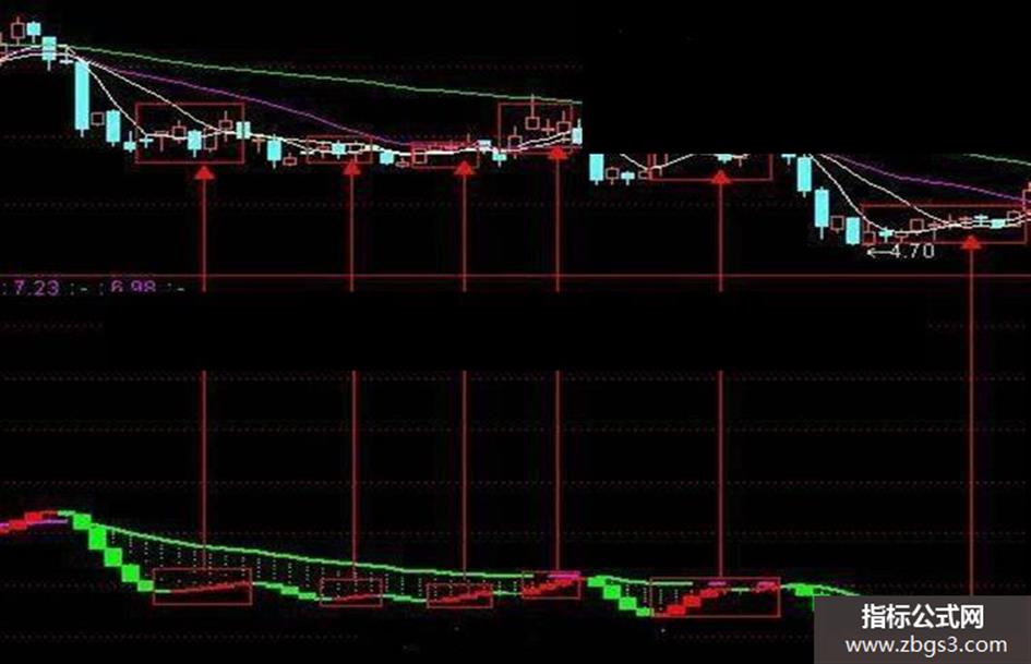 图中,阶梯状线和圆滑线出现了死叉,整个区域一片绿,线条变为绿色,线条内是绿点,与此对应的是K线的大幅下滑。行情进入冬眠期。也就是说,只要阶梯状线和圆滑线出现了死叉,就是空头行情到来的一个标志,绿色线体越大,那么股价下降的也就越剧烈。