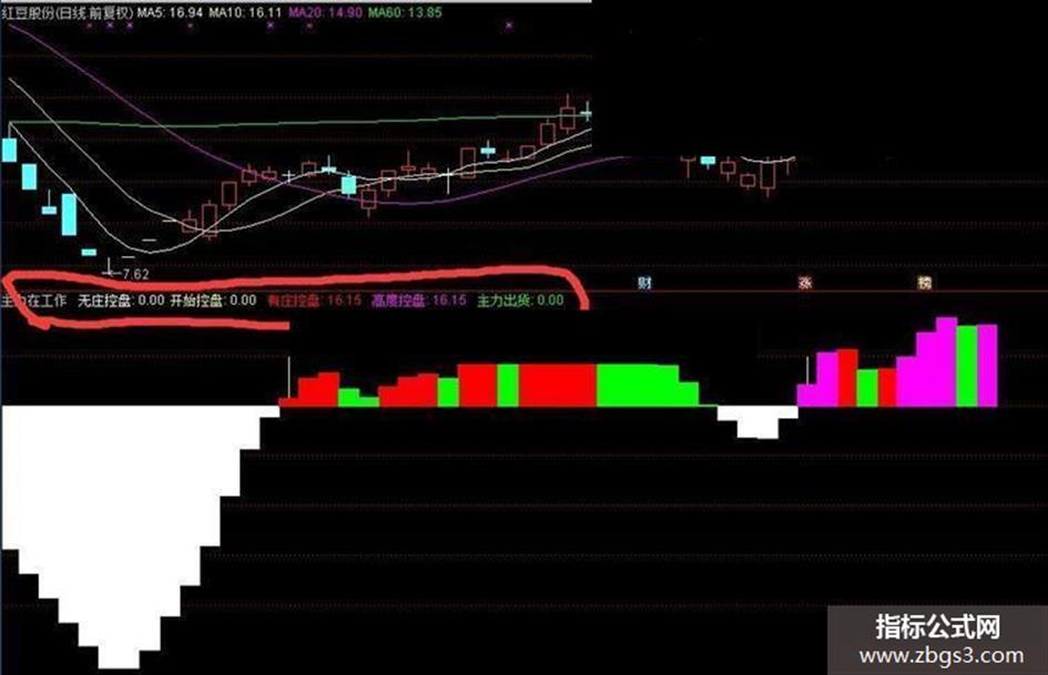 有庄控盘:IF(控盘>REF(控盘,1) AND 控盘>0,控盘,0),STICK,COLORRED;