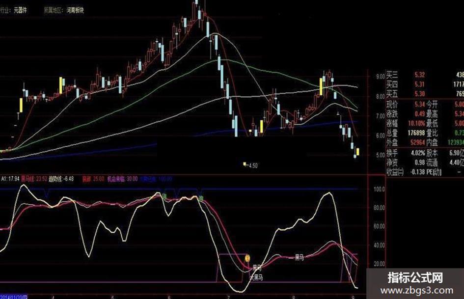 黑马线:EMA(A1,5),LINETHICK2,COLOR6600FF;