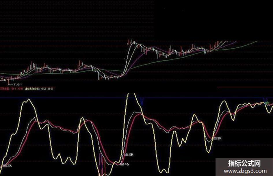 DRAWTEXT(CROSS(黑马线,A5)AND 趋势线<80,黑马线,'追涨');
