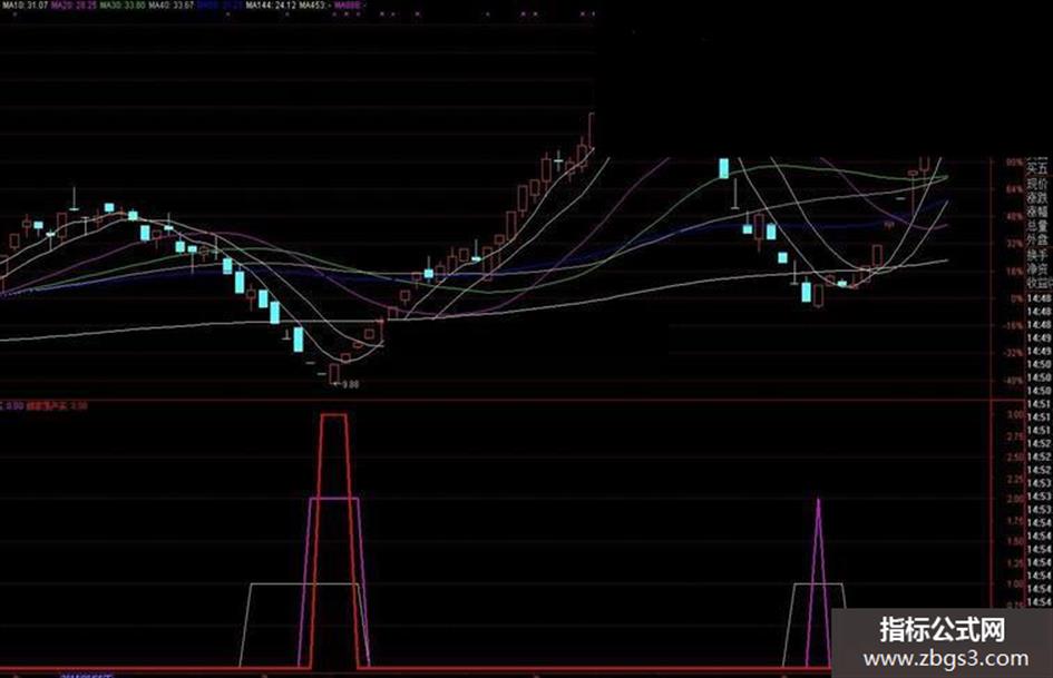中线买:IF(绝佳买点>10000 AND 绝佳买点>20000,2,0),COLORFF00FF,LINETHICK2;