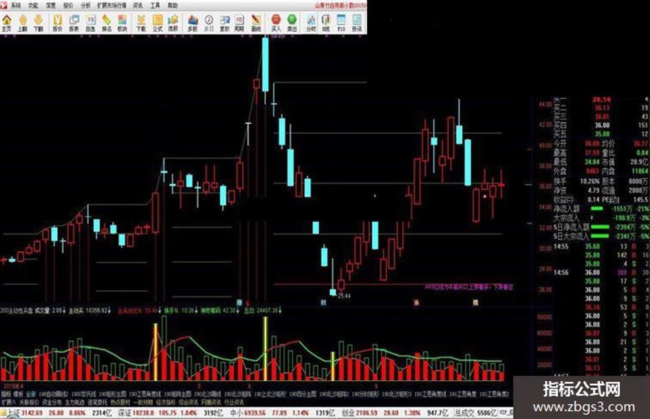 A45:IF(压力线1=REF(压力线1,1),(压力线1-支撑线1)*3/8+支撑线1,DRAWNULL),COLORRED;