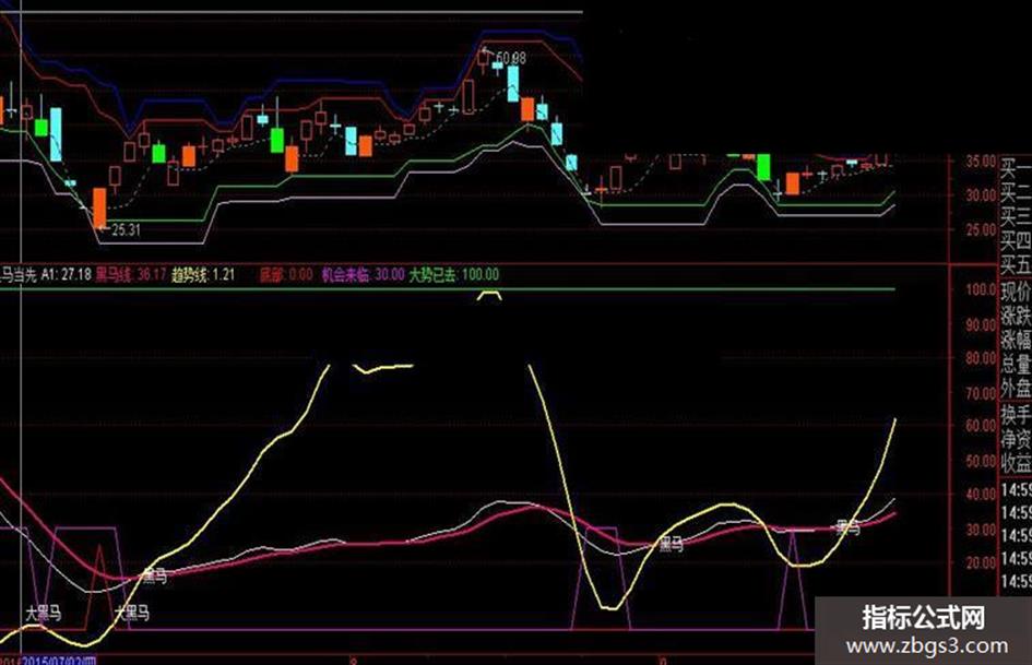 大势已去:IF(CROSS(黑马线,A1)AND 黑马线>70 AND 趋势线>80,90,100),COLORGREEN;