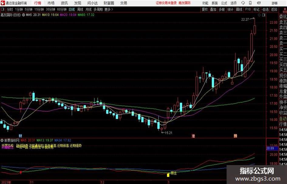 DRAWTEXT_FIX(1,0.005,0,0,'所属风格:'),COLORYELLOW;DRAWTEXT_FIX(1,0.06,0,0,FGBLOCK),COLORYELLOW;DRAWTEXT_FIX(1,0.005,0.05,0,'所属概念:'),COLORMAGENTA;DRAWTEXT_FIX(1,0.06,0.05,0,GNBLOCK),COLORYELLOW;MA5:MA(CLOSE,5), COLOR0000FF;MA13:MA(CLOSE,13) ,COLOR00FF00;MA34:MA(CLOSE,34) ,COLORFF8000;VARC:=SMA(MAX(C-REF(C,1),0),6,1)/SMA(ABS(C-REF(C,1)),6,1)*100;DRAWICON(CROSS(82,VARC),HIGH,2);VAR6:=REF(C,1);VAR7:=SMA(MAX(C-VAR6,0),6,1)/SMA(ABS(C-VAR6),6,1)*100;DRAWTEXT(CROSS(84,VAR7),H*1.01,'▲逃庄'),COLORGREEN ;VAR32:=CLOSE/REF(CLOSE, 1)>=1.062 AND HIGH/CLOSE< 1.005 AND MA(CLOSE, 90)/CLOSE>=1.150;VAR33:=VAR32 AND COUNT(VAR32, 20)=1 ;VAR34:=(INDEXC-REF(INDEXC, 1))/REF(INDEXC, 1);VAR35:=(CLOSE-REF(CLOSE, 1))/REF(CLOSE, 1);VAR36:=IF(VAR34>0.010, 0.900, 1) AND IF(VAR34>(-0.025), 1, 1.200);VAR37:=VAR36*(VAR35-VAR34)*100;VAR38:=SUM(VAR37, 10);VAR39:=SMA(VAR38, 40, 1);VAR310:=VAR38>20;VAR311:=CROSS(CLOSE, MA(CLOSE*1.055, 3)) AND CLOSE>OPEN*1.060 AND VOL>=REF(VOL, 1)*1.5 AND CLOSE>=MA(CLOSE, 10);VAR312:=VAR310 AND VAR311 ;VAR313:=(-100)*(HHV(HIGH, 3)-CLOSE)/(HHV(HIGH, 3)-LLV(LOW, 3));VAR314:= CROSS(VAR313, (-87)) AND OPEN=1.090*REF(CLOSE, 1) AND INDEXC>0.980*REF(INDEXC, 1) AND CLOSE<=1.470*LLV(CLOSE, 58);VAR315:=EMA(CLOSE, 12)-EMA(CLOSE, 26);VAR316:=EMA(VAR315, 9);VAR317:=2*(VAR315-VAR316);VAR318:=(CLOSE-LLV(LOW, 9))/(HHV(HIGH, 9)-LLV(LOW, 9))*100;VAR319:=SMA(VAR318, 3, 1);VAR320:=SMA(VAR319, 3, 1);VAR321:=EMA(IF(VAR316>REF(VAR316, 1), 1, (-1)), 14)*14;VAR322:=EMA(IF(VAR320>REF(VAR320, 1), 1, (-1)), 14)*14*2;VAR323:=(MA(CLOSE, 5)/MA(CLOSE, 70)-1)*100;VAR324:=(VAR323+VAR322+VAR321)/3;VAR325:=MA(CLOSE, 80)-MA(CLOSE, 10)/3;VAR326:=IF(CLOSE AND MA(VOL, 5)/240 AND CLOSE>REF(CLOSE, 1)*1.0 AND CLOSE,88,0);VAR327:=IF(CLOSE/REF(CLOSE, 1)>1.050 AND VOL/CAPITAL*100< 10 AND CLOSE< 17 AND HIGH/CLOSE< 1.010 AND VAR326>0, 91, 0);VAR328:=IF(VAR324>REF(VAR324, 1) AND REF(VAR324, 1)>0 OR VAR327>0, 85, 0);VAR329:=IF(VAR327>0 ,95,0), STICK,LINETHICK2;VAR330:=IF(VAR326>0 OR VAR327>0,91,0), STICK,LINETHICK2;VAR331:=IF(VAR328>0 OR VAR327>0 OR VAR326>0,88,0), STICK,LINETHICK2;VAR332:=100*(CLOSE-LLV(LOW,42))/(HHV(HIGH,42)-LLV(LOW,42)),LINETHICK1,COLORGREEN;VAR333:=COUNT(MA(CLOSE,3)>REF(MA(CLOSE,3),1),1)=1;VAR334:=(VAR332< 93 AND VAR333 AND MAX(MAX(VAR329, VAR330), VAR331))*100;STICKLINE(VAR327>90,LOW*0.99,LOW*0.95,2,0),COLORYELLOW;DRAWTEXT(VAR327>90,LOW,'←跟庄'),COLORYELLOW;A01:=DYNAINFO(7);A03:=BARSCOUNT(CLOSE);A04:=(SMA((CLOSE / HHV(HIGH,120)),3,1) * 100);A05:=IF((A03 > 20),A04,0);A06:=IF((LOW > A01),0,IF((HIGH < A01),1,(((A01 - LOW) + 0.009) / ((HIGH - LOW) + 0.009))));A07:=DMA(A06,(VOL / CAPITAL)) * 60;A09:=IF((((A07 > 0) AND (A07 > REF(A07,1))) AND (A05 <= 88)),A07,0);VAR1:=3*SMA((CLOSE-LLV(LOW,27))/(HHV(HIGH,27)-LLV(LOW,27))*100,5,1)-2*SMA(SMA((CLOSE-LLV(LOW,27))/(HHV(HIGH,27)-LLV(LOW,27))*100,5,1),3,1);VAR2:=EMA(VAR1,8);VAR3:=3*SMA((C-LLV(L,55))/(HHV(H,55)-LLV(L,55))*100,5,1)-2*SMA(SMA((C-LLV(L,55))/(HHV(H,55)-LLV(L,55))*100,5,1),3,1);趋势:=EMA(VAR3,3)-10;DRAWICON(CROSS(趋势,0),L,1);