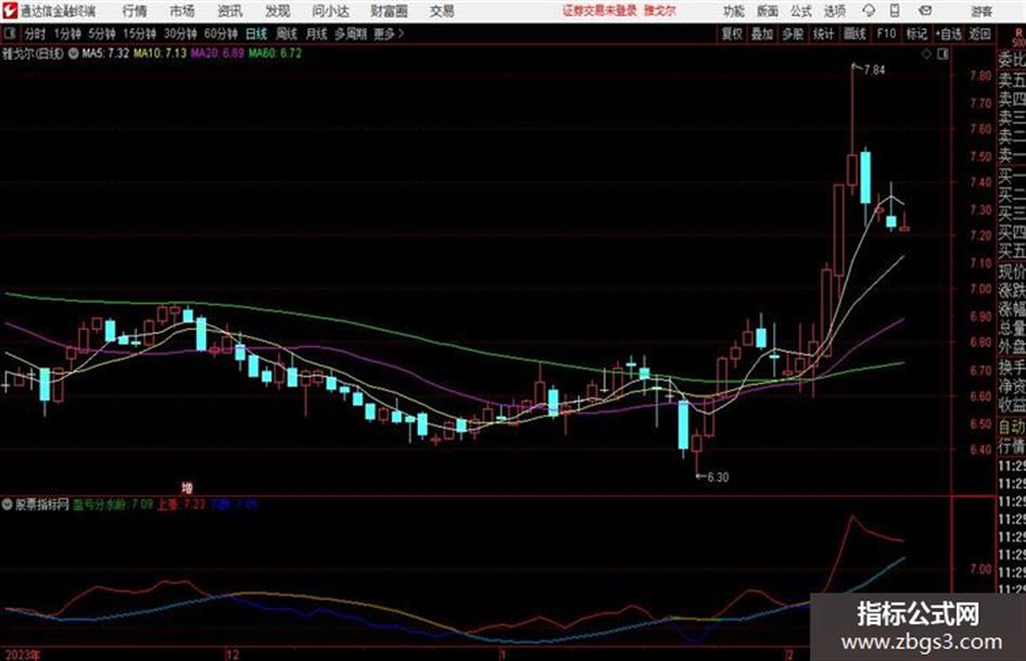 平均价:=(HIGH+4*LOW+OPEN+CLOSE)/7;均价差:= EMA(平均价,13) - EMA(平均价,34);移动均价:= EMA(均价差,5);差:=(均价差-移动均价)*5;A:=IF(差>=1000 ,1000 ,IF(差<=平均价,平均价,差) );盈亏分水岭:FORCAST(FORCAST(A,31),10),linethick2,color009900;上涨:IF(A>盈亏分水岭,A,盈亏分水岭),colorred;下跌:IF(A<盈亏分水岭,A,盈亏分水岭),colorblue;