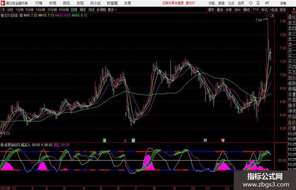 V8:=600*(EMA(C,3)-EMA(L,30))/EMA(L,30);V9:=EMA(V8,7);VA:=(WINNER(120*C/100)-WINNER(100*C/100))*100;VB:=(-100)*(WINNER(120*C/100)-WINNER(100*C/100))+5;底买入: IF(VA+VB< 7 AND CROSS(V8,V9) AND V9< -18 AND V9< VB,60,50);VC:=(2*C+H+L)/4;VD:=LLV(L,34);VE:=HHV(H,34);VF:=LLV(L,21);V10:=HHV(H,21);V11:=EMA((VC-VF)/(V10-VD)*100,5);V12:=EMA((VC-VD)/(VE-VD)*100,8);X:V11,colorwhite;顶区:V12;STICKLINE(V11-V12+20>=20 ,V11-V12+20 ,20 ,5 ,0 ),COLORF000FF;V13:=EMA(V12,5);STICKLINE(V12>0 AND (V12-V13)>=0 ,80 ,78 ,6 ,0 ),colorred;STICKLINE(V12>0 AND (V12-V13)<0 ,80 ,78 ,6 ,1 ),colorblue;STICKLINE(V12>0 AND (V12-V13)>=0 ,20 ,18 ,6 ,0 ),colorred;STICKLINE(V12>0 AND (V12-V13)<0 ,20 ,18 ,6 ,1 ),colorblue;STICKLINE(V12>V13 , V12,V13,15 ,1 ),colorgreen;