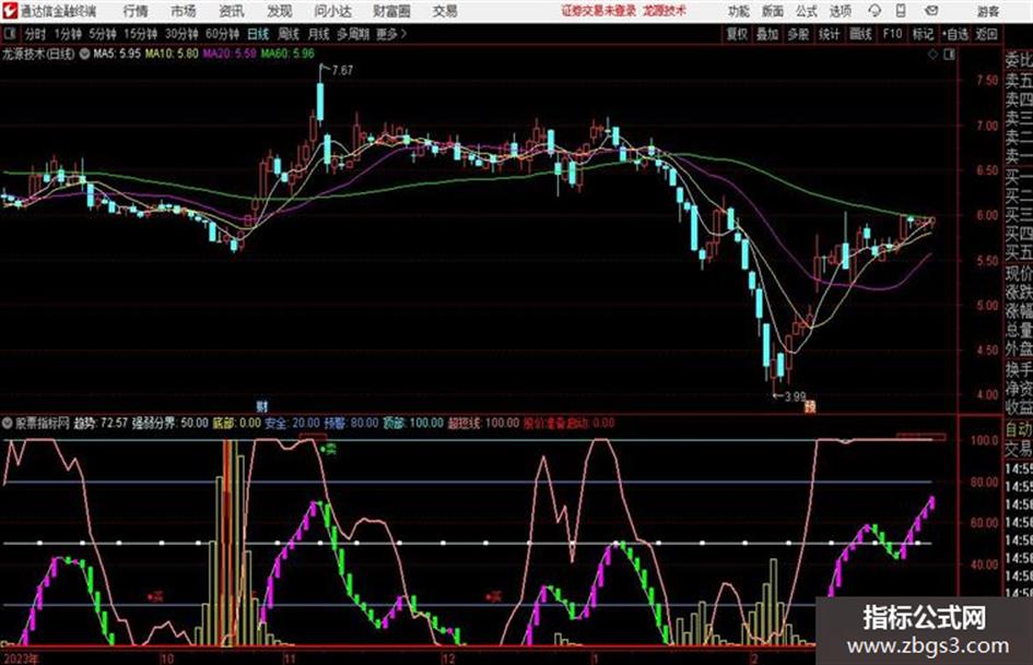 STICKLINE(REF(趋势,1)< 趋势, 趋势,REF(趋势,1),2,0),COLORMAGENTA;