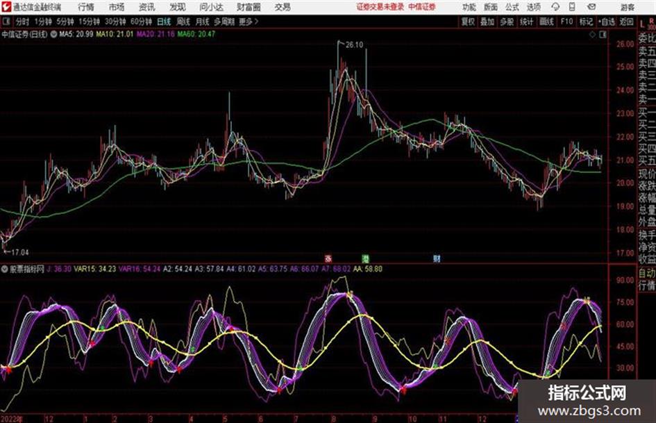 VAR2:=(CLOSE-REF(CLOSE, 1))/REF(CLOSE, 1)*100;VAR3:=(CLOSE-LLV(LOW, 18))/(HHV(HIGH, 18)-LLV(LOW, 18))*100;VAR4:=SMA(VAR3, 9, 1);VAR5:=SMA(VAR4, 3, 1);J:3*VAR4-2*VAR5,COLORFF00FF;VAR6:=J>1*REF(J, 1);VAR7:=LLVBARS(LOW, 50);VAR8:=SUM(VOL, VAR7);VAR9:=HHVBARS(HIGH, 50);VAR10:=SUM(VOL, VAR9);VAR11:=(CLOSE-REF(OPEN, VAR9))/REF(OPEN, VAR9)*100;VAR12:=VAR10/CAPITAL*100;VAR13:=(CLOSE-REF(OPEN, VAR7))/REF(OPEN, VAR7)*100;VAR14:=VAR8/CAPITAL*100;VAR15:MA(WINNER(CLOSE),3)*100;VAR16:EMA(VAR4,3);A2:EMA(VAR4,3), COLORFFDDCC,LINETHICK2;A3:EMA(A2,3), COLORFFBBCC;A4:EMA(A3,3), COLORFF99CC;A5:EMA(A4,3), COLORFF55CC;A6:EMA(A5,3), COLORFF33CC;A7:EMA(A6,3), COLORFF11CC,LINETHICK2;C1:=CROSS(A2,A7) AND A2>A7;DRAWICON(C1,A2,1);AA:EMA(A5,36),LINETHICK2, coloryellow;DRAWTEXT(CROSS(A4, AA) AND VAR11,A4,'#'),COLOR00FF00;DRAWTEXT(CROSS(A2,J) AND A2>75, A2, '峰'), coloryellow;DRAWTEXT(CROSS(J, A2) AND VAR6 AND A2<20 AND VAR2>9 OR A2>1*REF(A2, 1) AND VAR2>4 AND A2<60, A2, '拉'), colorred;