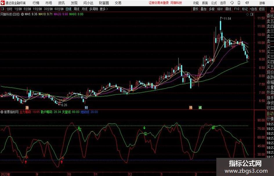 M:=34;RSV:=(CLOSE-LLV(LOW,8))/(HHV(HIGH,8)-LLV(LOW,8))*100;RSV1:=(CLOSE-LLV(LOW,13))/(HHV(HIGH,13)-LLV(LOW,13))*100;主力筹码:SMA(RSV,3,1),colorred;RSV2:=(CLOSE-LLV(LOW,21))/(HHV(HIGH,21)-LLV(LOW,21))*100;散户筹码:SMA(RSV2,5,1),colorgreen;天堂线:80,COLOR00FF00,DOTLINE;地狱线:20,COLORFF6600,DOTLINE;DRAWTEXT(COUNT(主力筹码>散户筹码,5)>2 AND CROSS(散户筹码,主力筹码) AND 主力筹码>60,散户筹码,'空'),colorgreen;DRAWTEXT(COUNT(主力筹码<散户筹码,5)>2 AND CROSS(主力筹码,散户筹码) AND 主力筹码<40,散户筹码,'多'),colorred;DRAWICON(COUNT(主力筹码>散户筹码,5)>2 AND CROSS(散户筹码,主力筹码) AND 主力筹码>60,天堂线,2);DRAWICON(COUNT(主力筹码<散户筹码,5)>2 AND CROSS(主力筹码,散户筹码) AND 主力筹码<40,地狱线,1);上标:=COUNT(主力筹码>86 AND 散户筹码>83,4);下标:=COUNT(主力筹码<14 AND 散户筹码<17,4);STICKLINE(主力筹码>86 AND 散户筹码>83 AND REF(主力筹码,1)<REF(散户筹码,1) AND 主力筹码>散户筹码*0.965,94,99,8,1),colorgreen;STICKLINE(主力筹码<14 AND 散户筹码<17 AND REF(主力筹码,1)>REF(散户筹码,1) AND 主力筹码<散户筹码*1.035,10,1,8,1),COLORFF00FF;