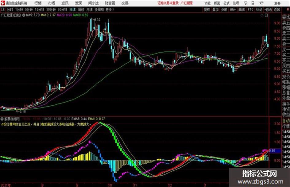 粉红黄同时金叉出现,并且3者距离越近大涨机会越高,力度越大。