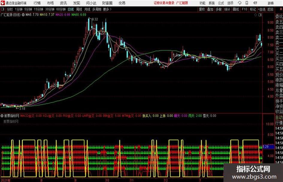 雨天:BARSLASTCOUNT(MACD金叉+KDJ金叉+RSI金叉+LWR金叉+BBI金叉+MTM金叉>0 AND MACD金叉+KDJ金叉+RSI金叉+LWR金叉+BBI金叉+MTM金叉<21 ),LINETHICK0;