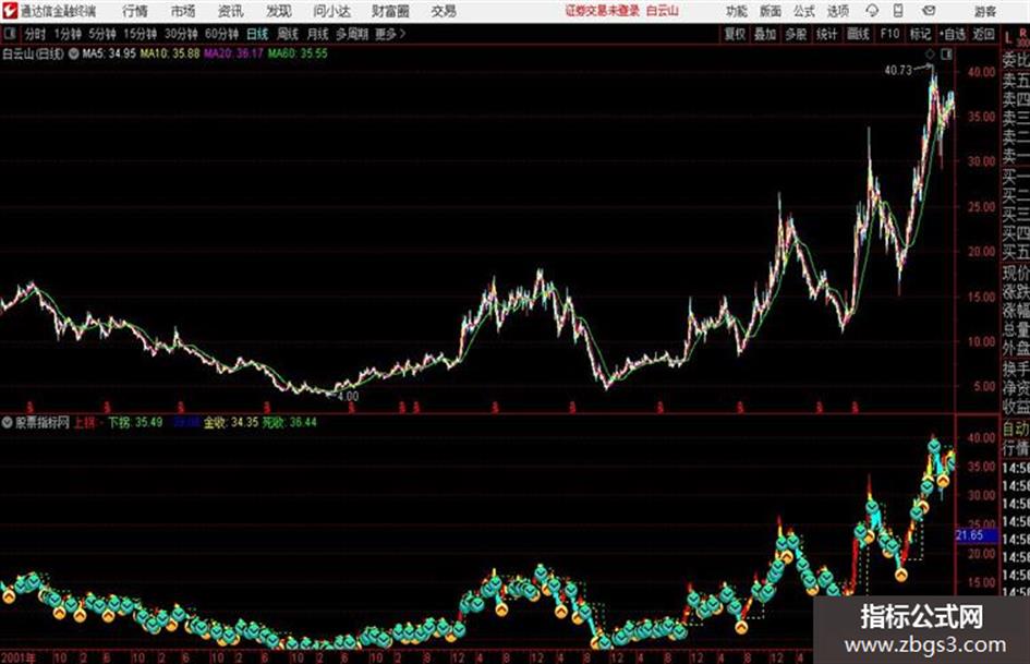 黄铢消失见顶:=IF(柱变向价>=DIF拐头价,柱变向价,DRAWNULL),COLORYELLOW,CIRCLEDOT,LINETHICK1;