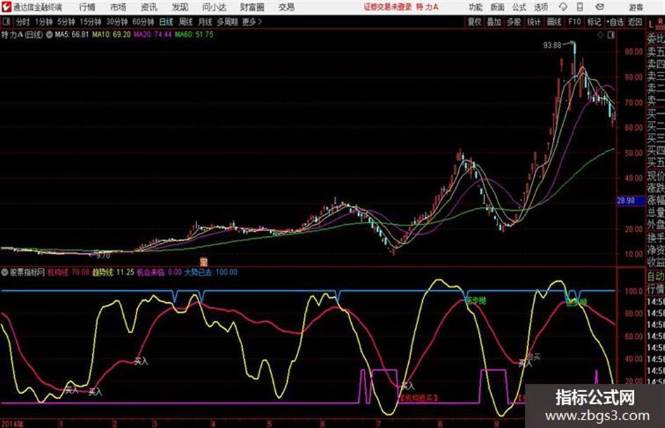 A1:=3*SMA((C-LLV(L,55))/(HHV(H,55)-LLV(L,55))*100,5,1)-2*SMA((C-LLV(L,55))/(HHV(H,55)-LLV(L,55))*100,5,1);机构线:EMA(A1,5),LINETHICK2,COLOR6600FF;A2:=(机构线-REF(机构线,1))/REF(机构线,1)*100;A3:=EMA(C,5);A4:=((C-LLV(L,21))/(HHV(H,21)-LLV(L,21)))*100;趋势线:(MA(3*SMA(A4,6,1)-2*SMA(SMA(A4,5,1),5,1),2)),LINETHICK2,COLORYELLOW;A5:=(HHV(H,60)-C)/(HHV(H,60)-LLV(L,60))*100;DRAWTEXT(FILTER(REF(机构线,1)>90 AND A2<0,7),机构线,'逐步抛'),COLOR00FF00;DRAWTEXT(CROSS(A1,机构线)AND 机构线<A5,机构线,'买入');DRAWTEXT(CROSS(机构线,A5)AND 趋势线<80,机构线,'追买'),COLOR558899;DRAWTEXT(CROSS(趋势线,0)AND 机构线<40,5,'【机构追买】'),COLOR0000FF;底部:=(A2<-10 AND A2>REF(A2,1))*25,COLORRED,LINETHICK2;机会来临:REF(IF((MA(C,5)-C)/C>0.04 AND (MA(C,10)-MA(C,5))/MA(C,5)>0.04,30,0),1),COLORF00FF0,LINETHICK2;大势已去:IF(CROSS(机构线,A1)AND 机构线>70 AND 趋势线>80,90,100),COLORFF9900,LINETHICK2;