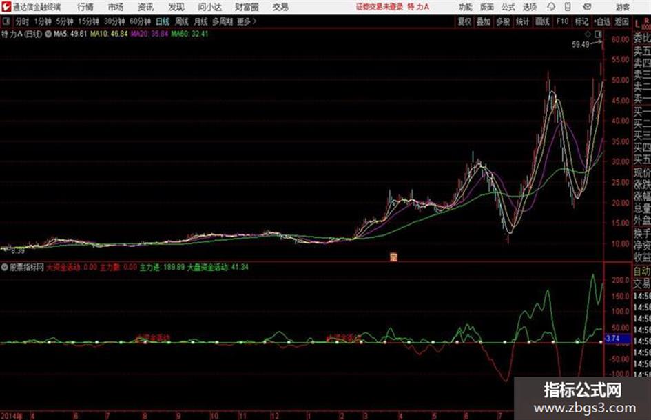 DRAWTEXT(VAR20 AND COUNT(VAR20,30)=1,15,'大资金活动'),COLORRED;