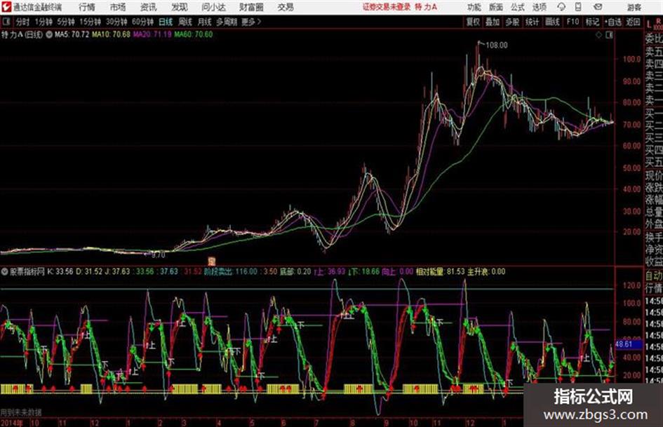 RSV:=(CLOSE-LLV(LOW,9))/(HHV(HIGH,9)-LLV(LOW,9))*100;K:SMA(RSV,3,1),COLORWHITE;D:SMA(K,3,1),COLORYELLOW;J:3*K-2*D,COLORYELLOW;IF(K<REF(K,1),K,DRAWNULL),COLORGREEN,LINETHICK1;IF(D<REF(D,1),D,DRAWNULL),COLORGREEN,LINETHICK1;IF(J<REF(J,1),J,DRAWNULL),COLORFFFF00,LINETHICK1;IF(K>REF(K,1),K,DRAWNULL),COLORRED,LINETHICK1;IF(D>REF(D,1),D,DRAWNULL),COLORRED,LINETHICK1;IF(J>REF(J,1),J,DRAWNULL),COLORFF00FF,LINETHICK1; OBV:=K;P:=5;A1:=REF(OBV,P)=HHV(OBV,2*P+1);B1:=FILTER(A1,P);阶段卖出:116,COLORC6C600;3.5,COLOR0088FF;{清仓卖出: 3.5,COLORFF75FF;}动力线:=K;STICKLINE(动力线>REF(动力线,1) ,动力线 ,REF(动力线,1),3 ,1),COLORRED;STICKLINE(动力线<=REF(动力线,1) ,动力线 ,REF(动力线,1),3 ,1),COLOR00FF00;底部:0.2,COLOR70DB93;{关注:0.5,COLORYELLOW;} C1:=BACKSET(B1,P+1);D1:=FILTER(C1,P);{高点}A2:=REF(OBV,P)=LLV(OBV,2*P+1);B2:=FILTER(A2,P);C2:=BACKSET(B2,P+1);D2:=FILTER(C2,P);{低点}↑上:REF(OBV,BARSLAST(D1)),COLORFF00FF,NODRAW;↓下:REF(OBV,BARSLAST(D2)),COLOR00FF00,NODRAW;向上:CROSS(OBV,↑上*1.01),NODRAW;相对能量:(OBV-↓下)/(↑上-↓下)*100,COLORYELLOW,NODRAW;R11:=BACKSET(ISLASTBAR,BARSLAST(D1)+1);S11:=R11>REF(R11,1);DRAWLINE(D1,OBV,S11,OBV,1),COLOR0000FF;T11:=BACKSET(ISLASTBAR,BARSLAST(D2)+1);U11:=T11>REF(T11,1);DRAWLINE(D2,OBV,U11,OBV,1),COLORFFFF00;STICKLINE(C>0,↓下,↓下,1,0),COLOR00FF00;STICKLINE(C>0,↑上,↑上,1,0),COLORFF00FF;DRAWTEXT(CROSS(OBV,↑上*1.01),↑上,'↑上'),COLORFFFFFF;DRAWTEXT(CROSS(↓下*0.99,OBV),↓下,'↓下'),COLORFFFFFF; {主升波段显示}BBI:=(EMA(CLOSE,3)+EMA(CLOSE,6)+EMA(CLOSE,12)+EMA(CLOSE,24))/4;EBBI:=(EMA(C,6)+EMA(C,18)+EMA(C,54)+EMA(C,162))/4;FF1:=EMA(C,3)>EMA(C,7) AND EMA(C,7)>EMA(C,21) AND EMA(C,21)>EMA(C,54);DIFF:=EMA(CLOSE,12)-EMA(CLOSE,26);DEA:=EMA(DIFF,9);主升浪:IF(BBI>EBBI AND FF1 AND DIFF>DEA,10,0),COLORYELLOW,POINTDOT;STICKLINE(主升浪,10,0,1,1),COLORYELLOW;DRAWICON(CROSS(K,D) AND CROSS(J,D),10,1);{1号图标显示红箭头};DRAWICON(D1,OBV,2);DRAWICON(D2,OBV,1);