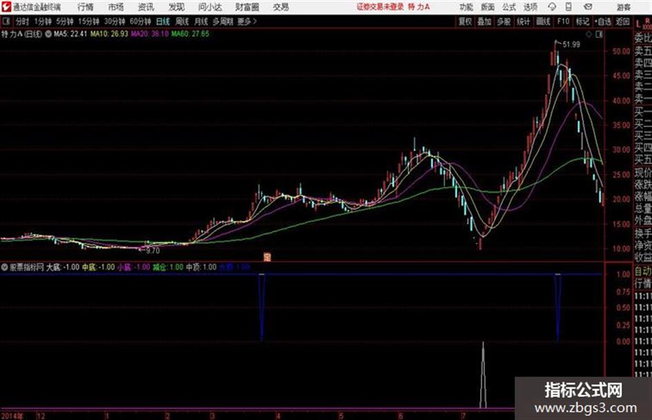输出大底:如果-5上穿VAR4ANDVAR3<-0.4,返回-0.01,否则返回-1