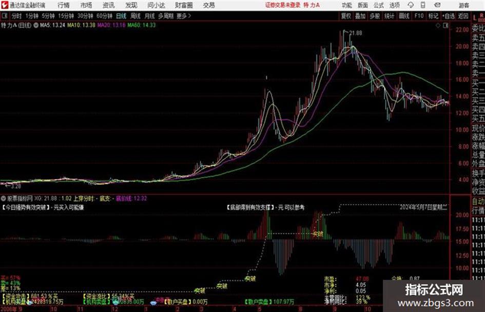 市销率:=STRCAT('市销率: ',CON2STR(C/(FINANCE(20)/FINANCE(1)),2));市净率:=STRCAT('市净率: ',CON2STR(C/FINANCE(34),2));净资收益率:=STRCAT('净资收益率: ',CON2STR(FINANCE(33)/FINANCE(34)*100,2));毛利率:=STRCAT('毛利率: ',CON2STR((FINANCE(20)-FINANCE(21))/FINANCE(20)*100,2));净利润率:=STRCAT('净利润率 ',CON2STR(FINANCE(30)/FINANCE(20)*100,2));主营利润率:=STRCAT('主营利润率 ',CON2STR(FINANCE(23)/FINANCE(20)*100,2));利润同比:=STRCAT('利润同比: ',CON2STR(FINANCE(43),2));收入同比:=STRCAT('收入同比: ',CON2STR(FINANCE(44),2));X1:=(FINANCE(11)-FINANCE(15))/FINANCE(10)*1.2;X2:=(FINANCE(31)+FINANCE(17))/FINANCE(10)*1.4;X3:=FINANCE(23)/FINANCE(10)*3.3;X4:=FINANCE(19)/FINANCE(15)*0.6;X5:=FINANCE(20)/FINANCE(15)*0.999;Z值:=X1+X2+X3+X4+X5;预警:=IF(Z值<1.2,'重警',IF(Z值>=1.2 AND Z值<2.6,'轻警','无警'));财务预警:=STRCAT('财务预警: ',STRCAT(预警,STRCAT('-Z值: ',CON2STR(Z值,3))));优质资产率:=STRCAT(' 优质资产率: ',CON2STR((FINANCE(19)-FINANCE(22)-FINANCE(27))/FINANCE(19),2));现金负债比:=STRCAT(' 现金负债比: ',CON2STR(FINANCE(25)/FINANCE(15),3));财务系数:=STRCAT('风险系数: ',STRCAT(STRCAT(财务预警,优质资产率),现金负债比));DRAWTEXT_FIX(ISLASTBAR,0.50,0.05,0,财务系数),COLORYELLOW;D1:=YEAR AND MONTH AND DAY;AA1:=STRCAT(CON2STR(YEAR,0),'年');AA2:=STRCAT(CON2STR(MONTH,0),'月');AA3:=STRCAT(CON2STR(DAY,0),'日');AA4:=STRCAT('星期',IF(WEEKDAY=1,'一',IF(WEEKDAY=2,'二',IF(WEEKDAY=3,'三',IF(WEEKDAY=4,'四',IF(WEEKDAY=5,'五',IF(WEEKDAY=6,'六','日')))))));AA:=STRCAT(STRCAT(STRCAT(AA1,AA2),STRCAT(AA3,AA4)),'');DRAWTEXT_FIX(D1,0.888,0.001,0,AA),COLORLIGRAY;MZ0:=(BARSLAST(((HOUR=9) AND (MINUTE=31)))+1);上穿分时:IF(((SETCODE<2) AND (CONST(MZ0)<241)),CONST(IF((TIME<1000),HHV(CLOSE,0),SUM((IF((TIME=1000),1,0)*HHV(CLOSE,0)),0))),DRAWNULL)LINETHICK1,DOTLINE,COLOR00FFFF;底支:IF(((SETCODE<2) AND (CONST(MZ0)<241)),CONST(IF((TIME<1000),HHV(CLOSE,0),SUM((IF((TIME=1000),1,0)*LLV(CLOSE,0)),0))),DRAWNULL),LINETHICK1,COLOR00FFFF;STICKLINE(TIME=931 OR TIME=1000,上穿分时,底支,0,-1),COLORLIBLUE;分时上突:=CROSS(C,上穿分时);上突:=C<上穿分时 AND 上穿分时>底支;DRAWICON(分时上突,C,11);股价支撑线:=MA(CLOSE,20);底价线:股价支撑线-2*STD(CLOSE,20),NODRAW,COLORMAGENTA,LINETHICK2;DRAWTEXT_FIX(1,0.0001,0.00,0,STRCAT(STRCAT('【今日强势有效突破】',CON2STR(上穿分时,2)),' 元买入可能赚')),COLORWHITE,LINETHICK1;DRAWTEXT_FIX(1,0.5001,0.00,0,STRCAT(STRCAT('【底部得到有效支撑】',CON2STR(底支,2)),' 元 可以参考')),COLORWHITE,LINETHICK1;所属板块:=STRCAT('【所属板块】',STRCAT(STRCAT(STRCAT(' [行业]—',HYBLOCK),STRCAT(' [地域]—',DYBLOCK)),STRCAT(' [概念]—',GNBLOCK)));DRAWTEXT_FIX(ISLASTBAR,0.005,0.05,0,所属板块),COLORWHITE;