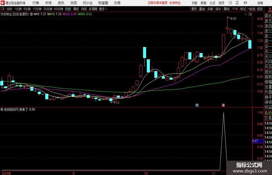 DIF4:=EMA(CLOSE,12)-EMA(CLOSE,26);DEA4:=EMA(DIF4,9);ZTB:=C>INTPART(REF(C,1)*(1+10/100)/0.01+0.5)*0.01-0.006 AND C=H;启动版:=DIF4>-0.2 AND DIF4<0.35 AND ZTB AND REF(ZTB,1)<1 AND COUNT(EMA(CLOSE,12)-EMA(CLOSE,26)>=-0.01,5)=5;妖来了:启动版;