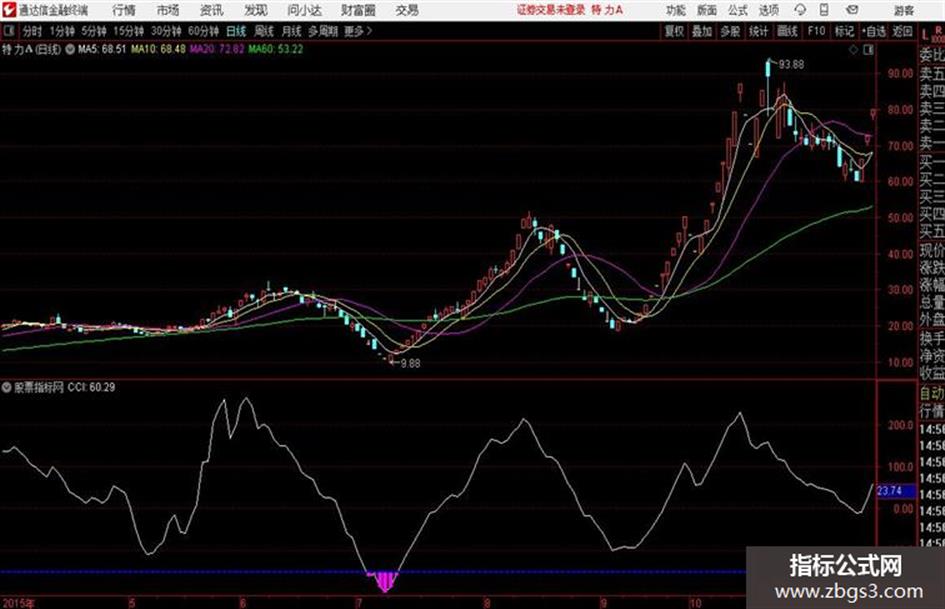 TYP赋值:如果(最高价>CANDC>开盘价)OR(最高价>OANDO>=收盘价),返回收盘价,否则返回最高价+如果(最低价输出CCI:(TYP-TYP的36.0270012日简单移动平均)/(0.015*TYP的36.0270012日平均绝对偏差)的2.0332日指数移动平均,画白色