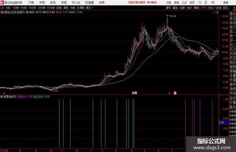 VAR1:=((LLV(LOW,5) = LLV(LOW,45)) AND (CLOSE >= (OPEN * 1.04)));VAR2:=(CLOSE > ((REF(HIGH,1) + REF(LOW,1)) / 2));VAR3:=REF(CLOSE,1);VAR4:=((SMA(MAX((CLOSE - VAR3),0),6,1) / SMA(ABS((CLOSE - VAR3)),6,1)) * 100);发现主力:(VAR1 AND VAR2),STICK,COLORMAGENTA;逃之夭夭:CROSS(80,VAR4),STICK,COLORGREEN;