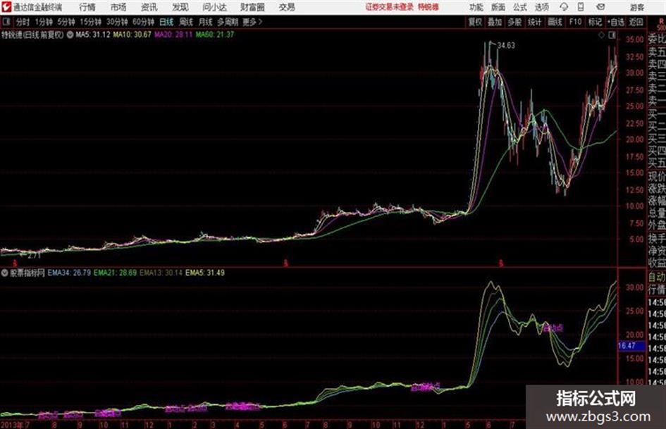 TJ赋值: EMA13-EMA5的绝对值1日前的EMA5 AND EMA13>1日前的EMA13 AND EMA21>1日前的EMA21 AND EMA34>1日前的EMA34