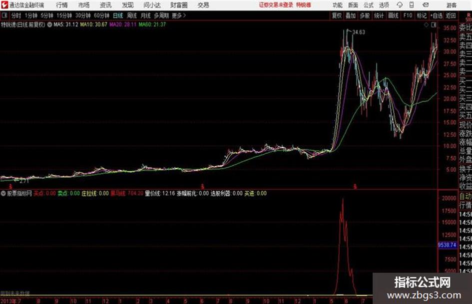 黑马线: IF( VAR28>0.1,VAR29,0)*5, COLORRED;