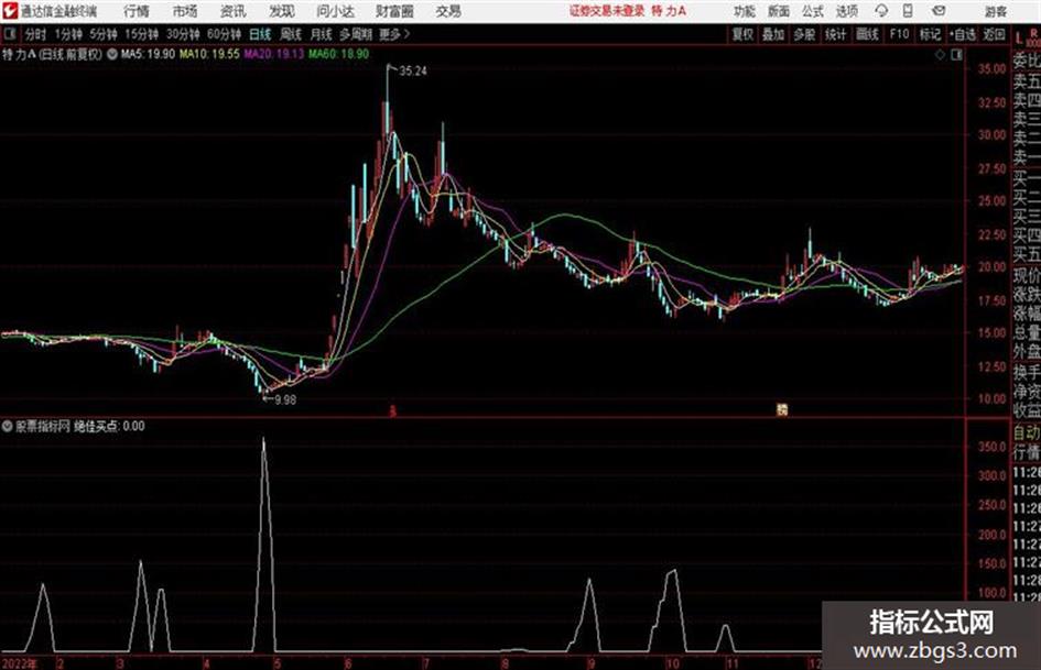 绝佳买点:IF(C=C,MA(IF(LOW<=VARF10,(VARFF+VARF11*2)/2,0),3),100000000)/(200);