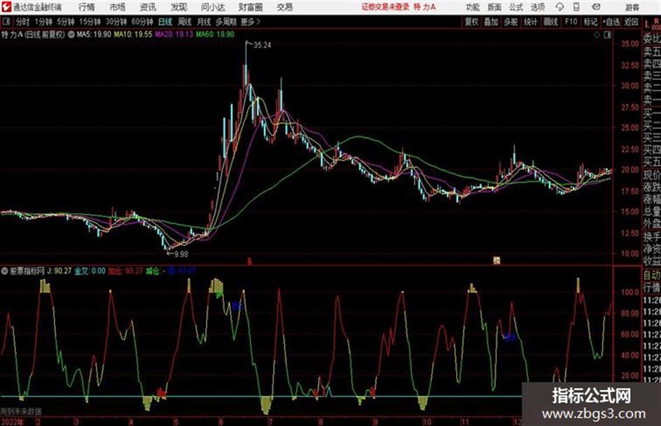 输出减仓:如果J当满足条件(J>100ANDK>=60)时,在100和J位置之间画柱状线,宽度为1,1不为0则画空心柱.,画黄色