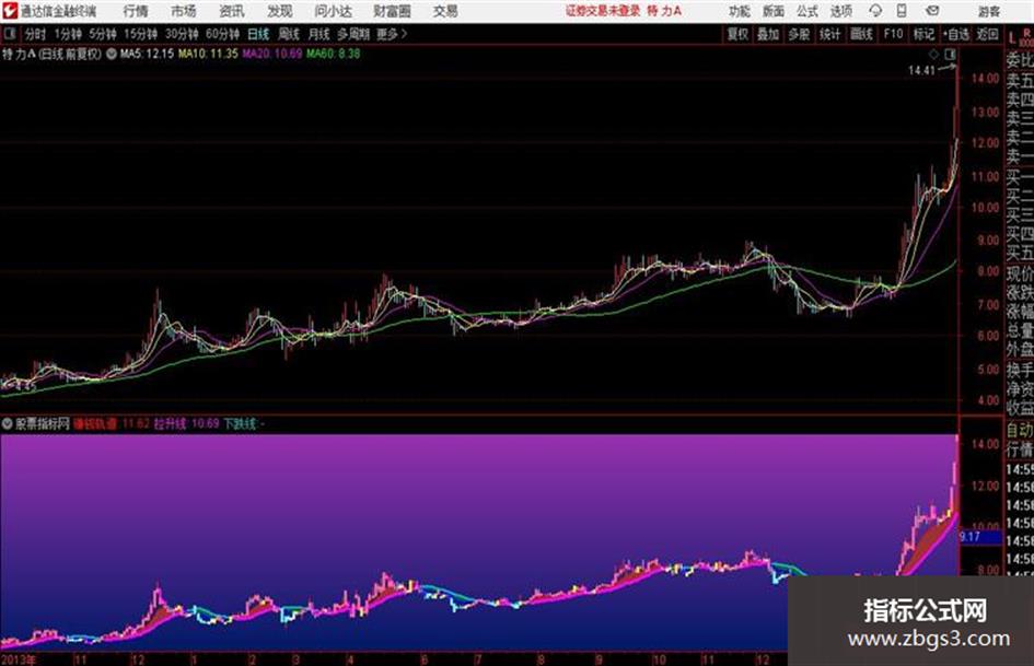 拉升线:IF(赚钱轨道>X_1,X_1,DRAWNULL),COLORMAGENTA,LINETHICK3;