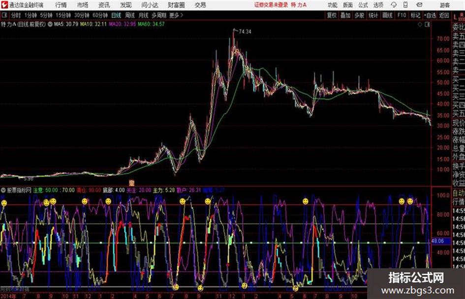 当满足条件动力线上穿底部的20日过滤时,在动力线+0.4位置画5号图标