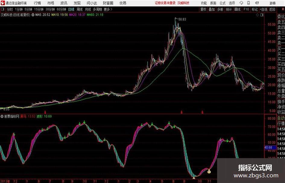 副图中,红线表示黑马线,绿色细线表示波段线,黑马线由下而上上穿波段线表示股价进入拉升区间,钱袋子表示黑马买入信号,绿色箭头离场或减仓信号。