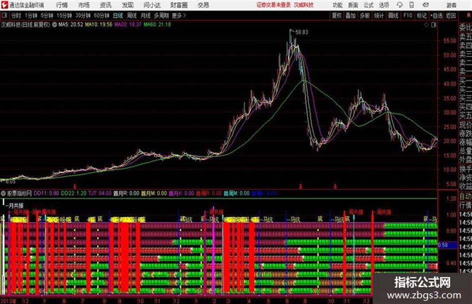 月D1赋值:"KDJ的D[取月线数据]"(9,3,3),画洋红色