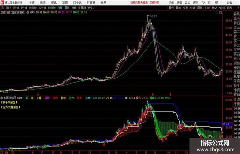DRAWTEXT_FIX(CURRBARSCOUNT=1 AND HSL>15 AND HSL<25,0.3,0.05,0, '★该股票巨量!'),COLORYELLOW;