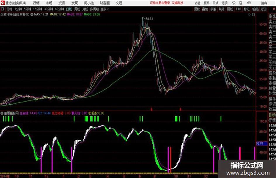 擎天柱:IF(CROSS(VARC,生命线) AND VARC>VARD AND VARC<55 AND C>O,50,0),COLORFF00FF,STICK,LINETHICK4;